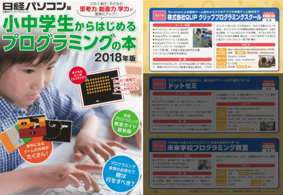 日経BPパソコンベストムック「小中学生からはじめるプログラミングの本(2018年版)」でクリップ プログラミングスクールが紹介されました。
