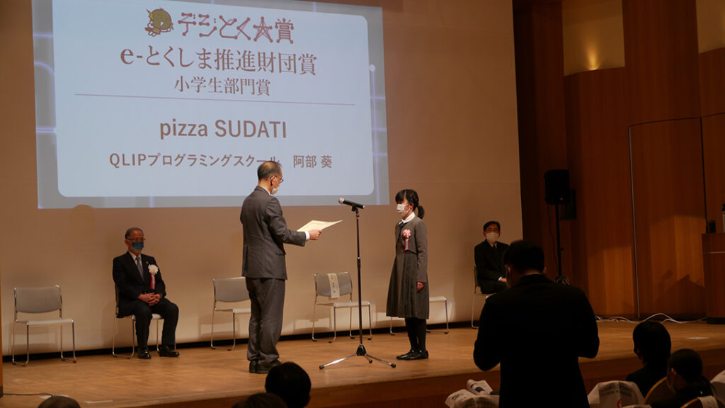 令和4年2月1日に開催された「第1回デジタルとくしま大賞」受賞式では、スクール生の興津直さん(e-とくしま推進財団賞<学生部門賞>)、阿部 葵さん(e-とくしま推進財団賞<小学生部門賞> & STNet賞)、芳岡 勇俊さん(富士通Japan賞)が各賞を受賞しました。