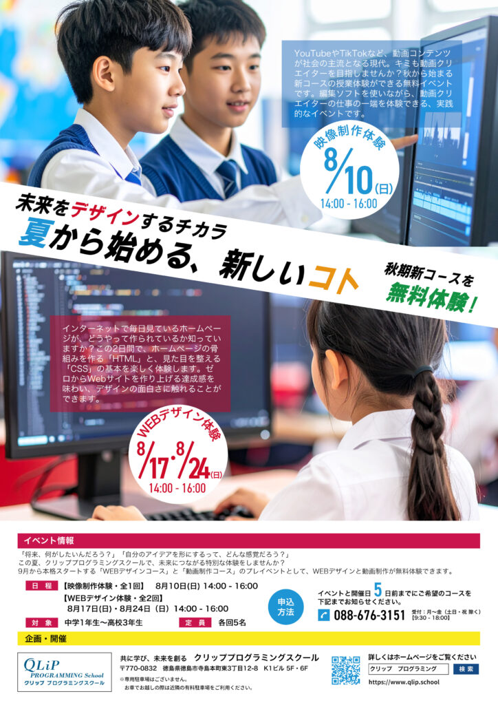 この夏、クリッププログラミングスクールで、未来につながる特別な体験をしませんか?9月から本格スタートする「Webデザインコース」と「動画制作コース」のプレイベントとして、Webデザインと動画制作が無料体験できます。